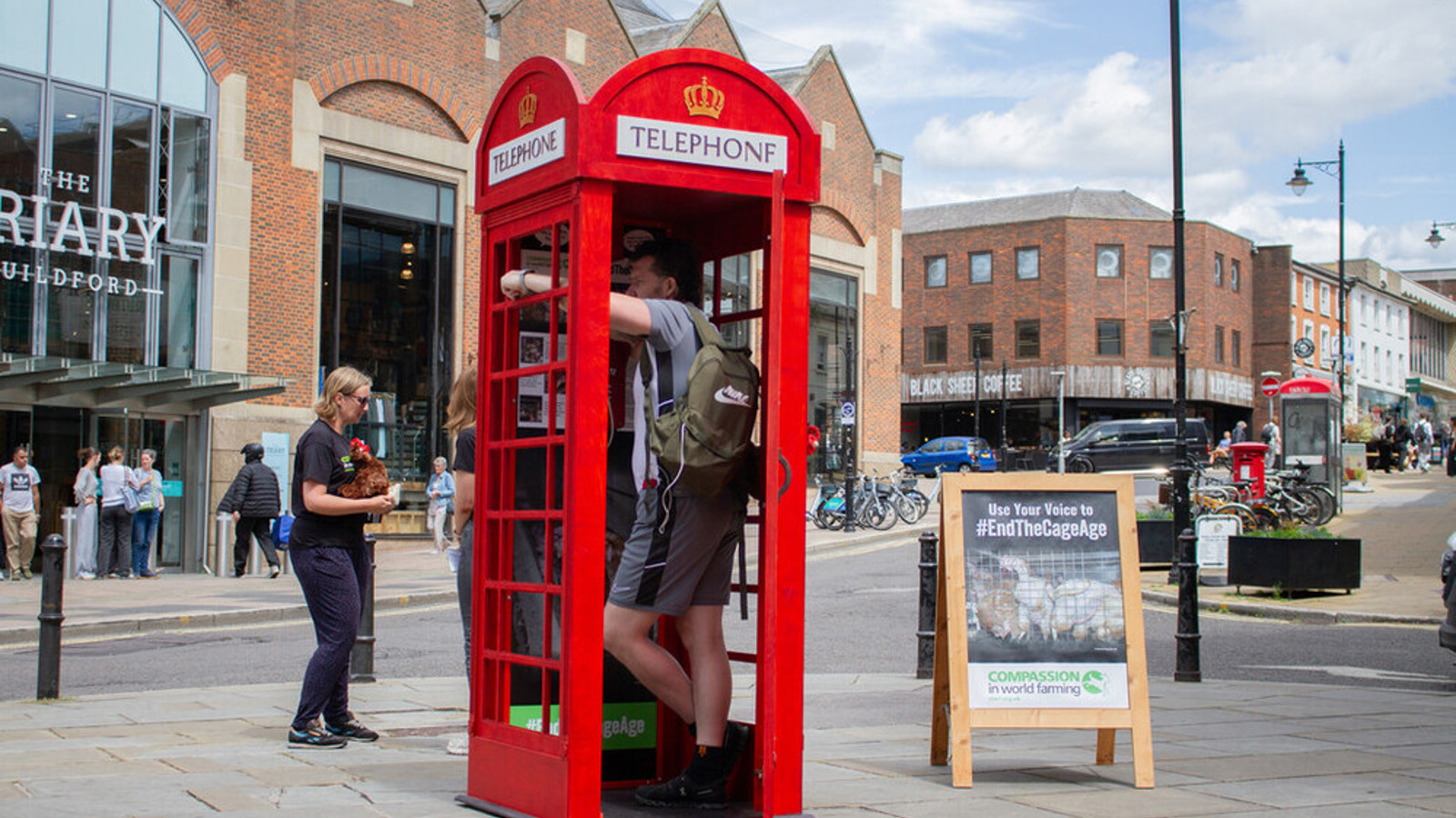 Phone box stunt highlights plight of caged hens